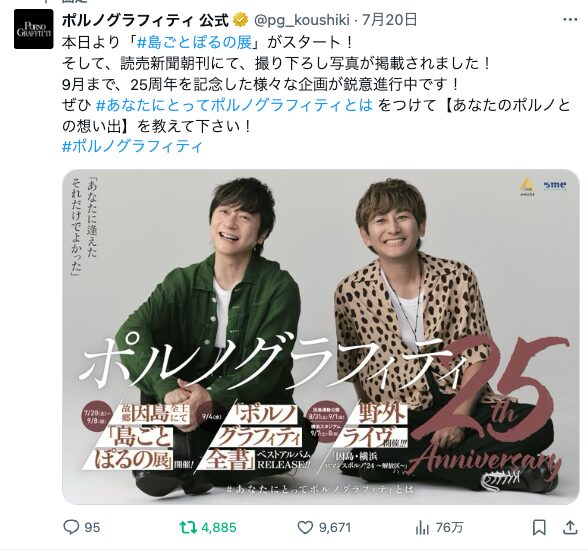 ポルノグラフィティ25周年に際する、キャッチコピー、新聞広告、WEBCMの企画制作。キーコピーとなる「#あなたにとってポルノグラフィティとは」はXで公開時、トレンド入りするほどの賑わいを見せた。
