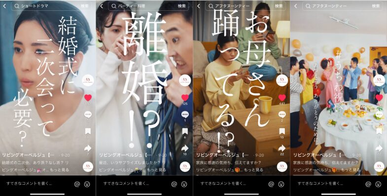 Instagram/TikTokにキャンペーンようアカウントを開設して、マンション「オーベルジュ・メゾン」に住む3世帯が「リビングオーベルジュ」を活用することで、それぞれの人生がより豊かになっていく様子をオムニバス形式で展開しました。