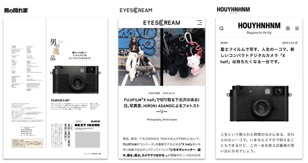 通常のX seriesの場合は通例的な発表会を行うが、今回はカメラエントリー層(20-30代男女)に向けた機種であり、ハーフカメラという要素もあり、新旧の文化や建造物が立ち並ぶ下北沢で実施した。メディアについてもカメラや経済系のメディアだけではなく、ファッション、カルチャー系のメディアにもお越しいただき新しい層へのリーチを試みた。