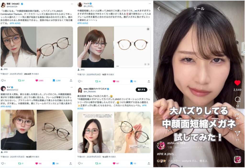 「中顔面短縮」という効果がある製品であることをInstagram美容系インフルエンサーとXのインフルエンサーを起用し拡散。メガネという商材でありながら「中顔面短縮」という美容キーワードで拡散することで美容好きの女性に大してアプローチ。チークカラーレンズやコンシーラーカラーレンズなどCombination Titaniumと愛称が良いレンズも一緒に紹介することでさらに魅力のある投稿となっている。